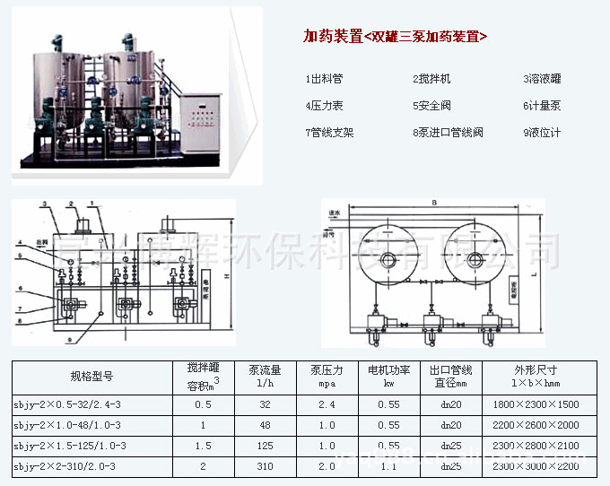 加藥裝置三種型號,都有三大部分組成:1. 攪拌機(jī) 2. 溶液槽 3. 計(jì)量裝置及投加設(shè)置。