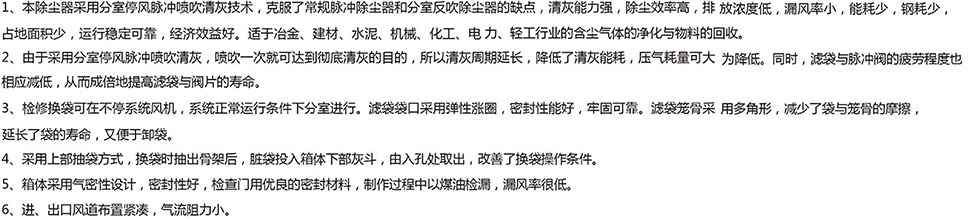 含塵氣體由進(jìn)氣口進(jìn)入灰斗、或通過敞開法蘭口進(jìn)入濾袋室,含塵氣體通過除塵器濾袋過濾為凈化氣體進(jìn)入凈氣室,再經(jīng)凈氣室排氣口,由風(fēng)機(jī)排走。粉塵積附在濾袋的外表面,且不斷增加,使袋式除塵器的阻力不斷上升,為使設(shè)備阻力不超過1200Pa,袋除塵器能繼續(xù)工作,需定期清除濾袋上的粉塵,清灰是由PLC程序控制器定時順序起啟動脈沖閥,使氣包內(nèi)壓縮空氣(0.5-0.7Mpa)由噴吹管噴出(稱一次風(fēng))通過文氏管誘導(dǎo)數(shù)倍于一次風(fēng)的周圍空氣(稱二次風(fēng))進(jìn)入濾袋使濾袋在瞬間急速膨脹,并伴隨著氣流的反向作用力抖落粉塵,達(dá)到清灰的目的。
